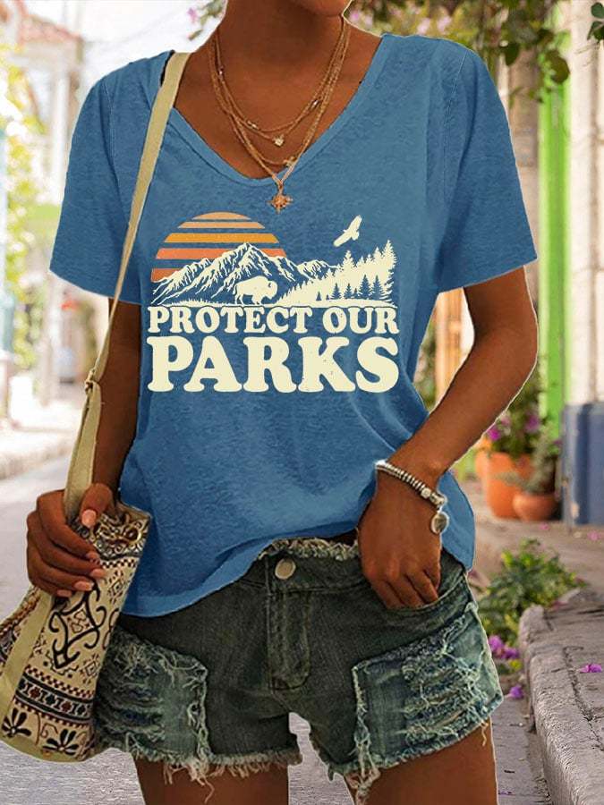 Women's Protect Our Parks Print V Neck Casual T-Shirt