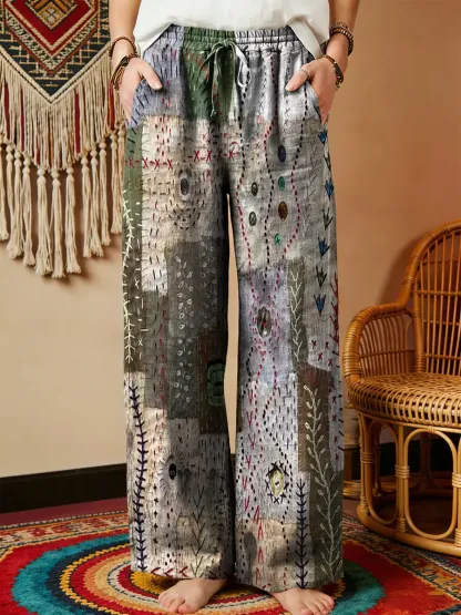 Women's Ethnic Patchwork Pattern Printed Drawstring Pocket Cotton And Linen Trousers