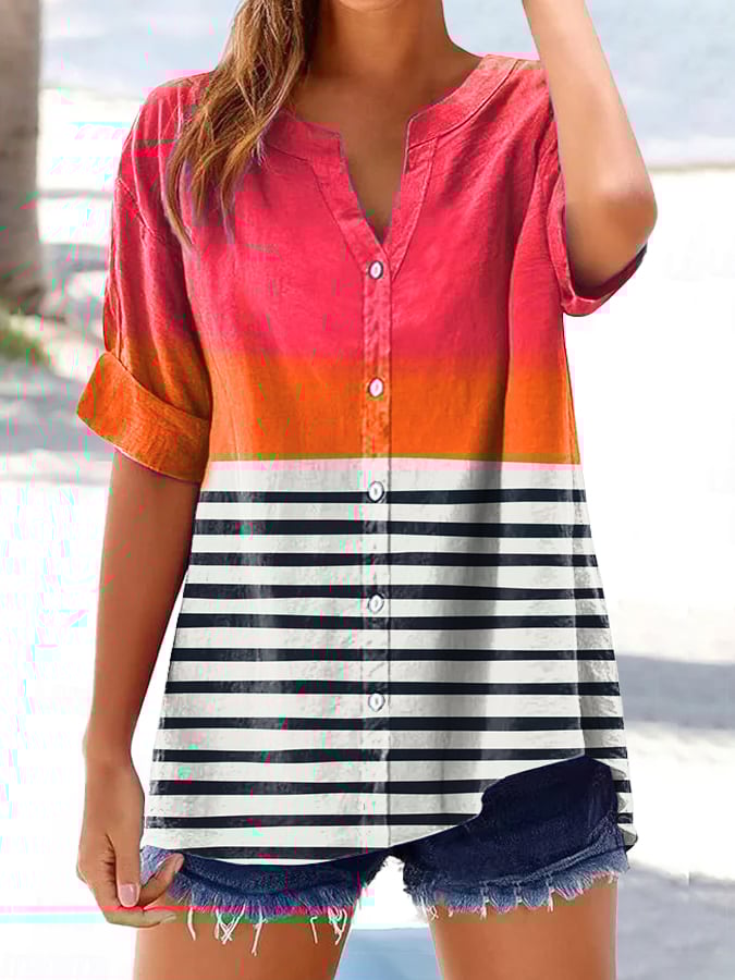 Women's Retro Striped Button Design V-Neck Short Sleeve Shirt