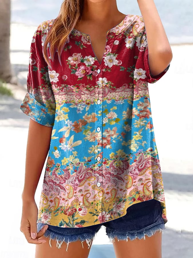 Women's Colourful Art Flowers Print Casual Cotton And Linen Shirt