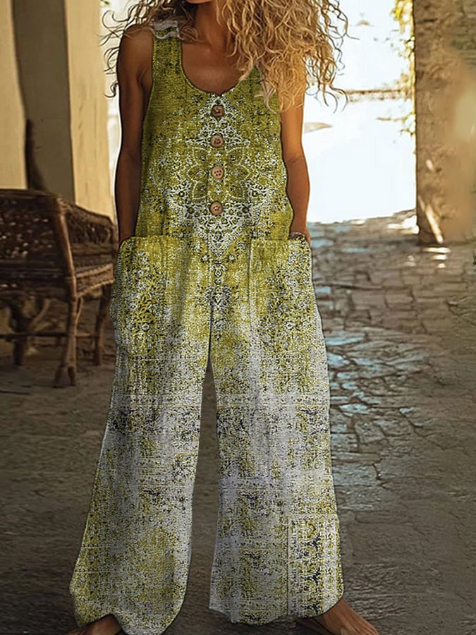 Women's Casual Retro Pattern Cotton And Linen Jumpsuit