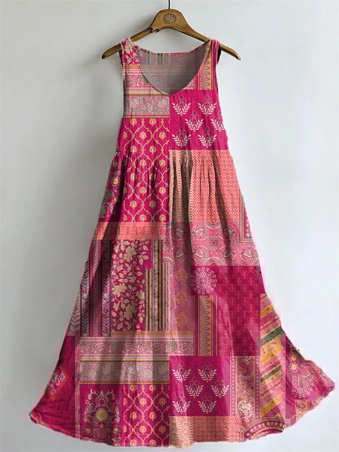 Women's Casual Retro Floral Patchwork Cotton And Linen Vest Dress