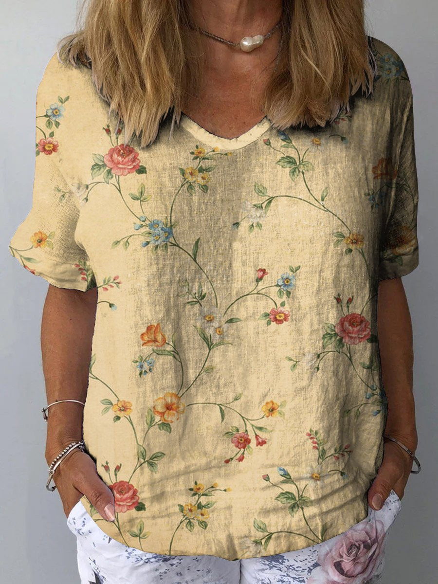 Women's Vintage Flower Art Print Casual Linen V-neck Shirt