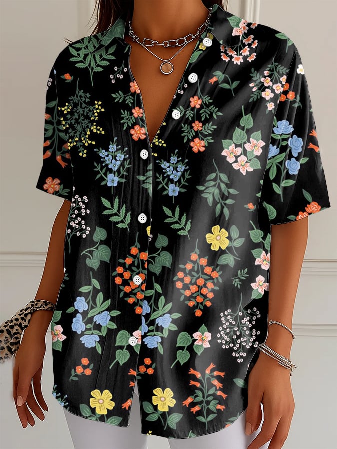 Women's Vintage Botanical Floral Button Design V-Neck Short Sleeve Shirt