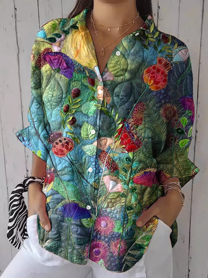 Women's Casual Vintage Floral Art Cotton and Linen Shirt