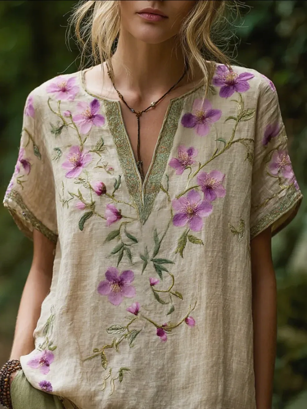 Bohemian Style Flower Vintage V-neck Short-sleeved Shirt