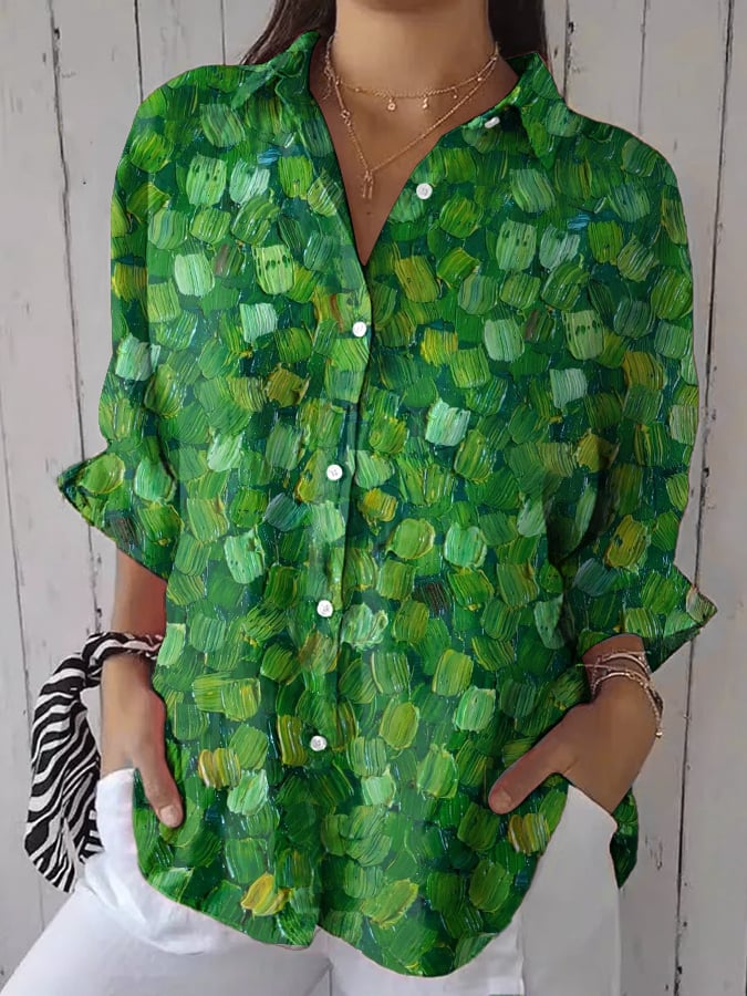 Women's Casual Green Forest Art Oil Painting Print Shirt