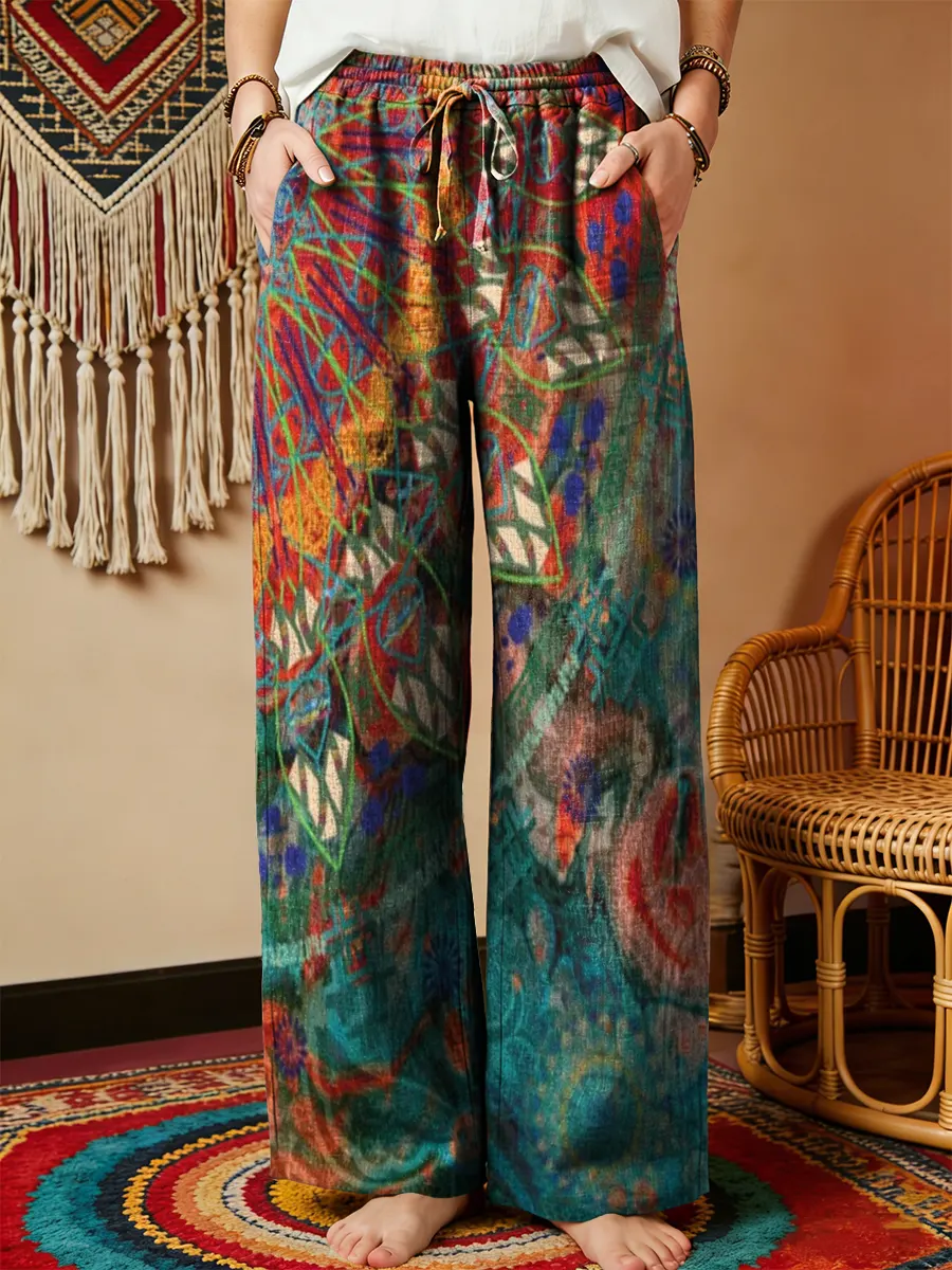Women's Ethnic Mandala Print Drawstring Pocket Cotton And Linen Trousers