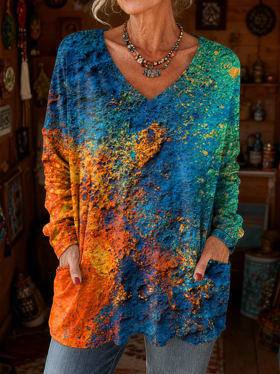Women's Retro Color Block Colorful Art Print Casual Long Sleeve V-Neck T-Shirt