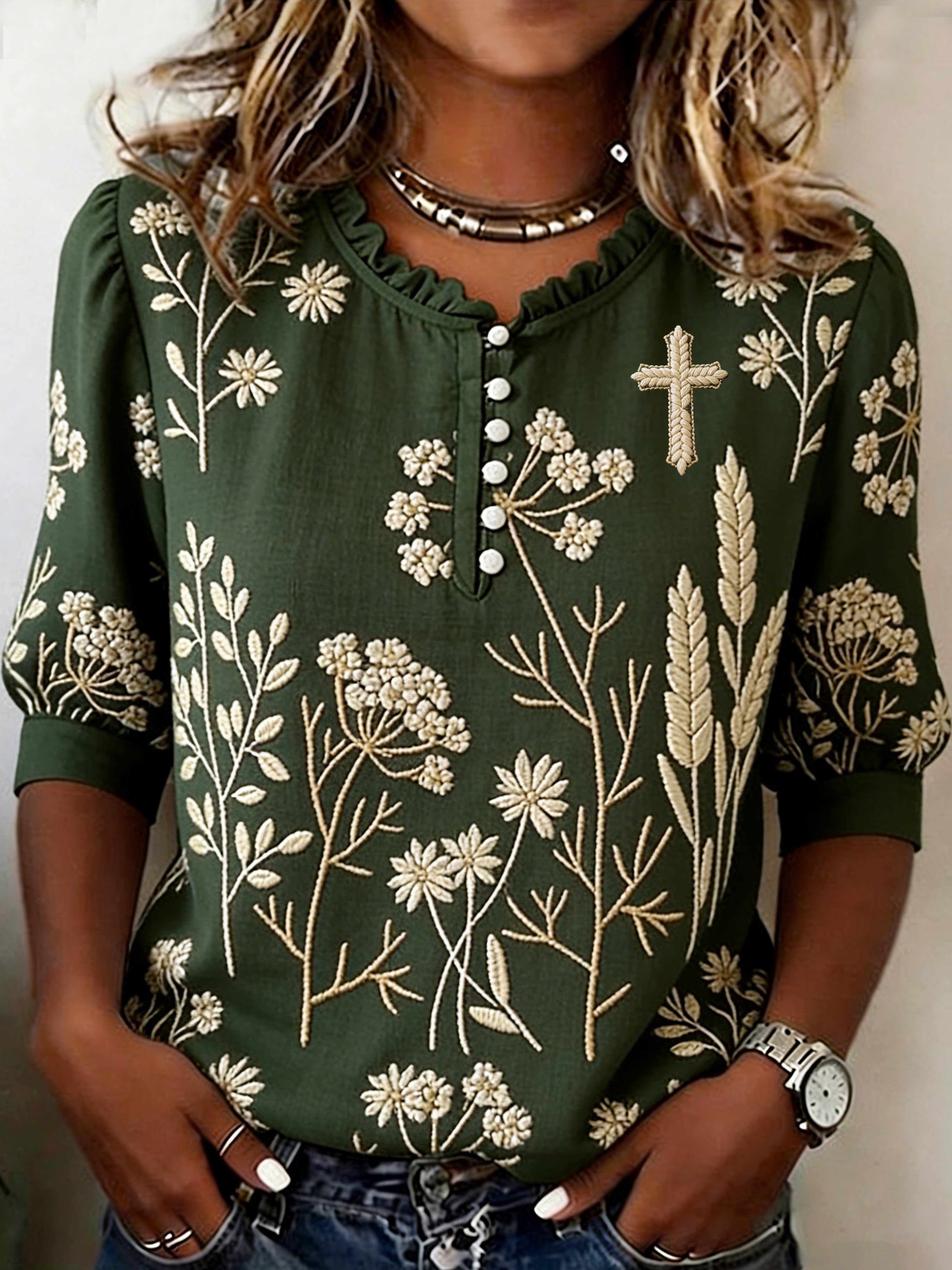 Ethnicity Geometry Flowers Green Women's Vintage Art Print Casual Cotton And Linen Shirt