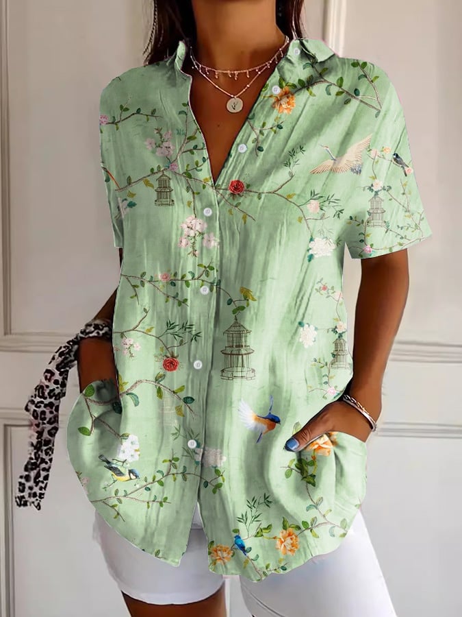 Women's Casual Floral and Bird Print Short Sleeve Shirt