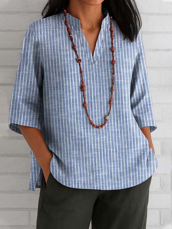 Women's Retro Striped Design Stand Collar Mid-Sleeve Shirt