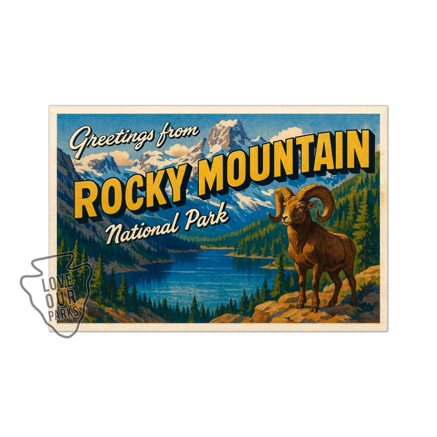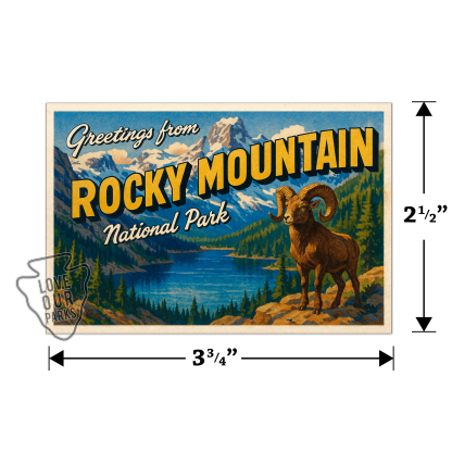 Show your love for Colorado’s high country with our Rocky Mountain National Park Postcard Magnet. A bighorn sheep stands proudly near a crystal-clear lake with snow-capped peaks in the distance—a tribute to alpine adventure.