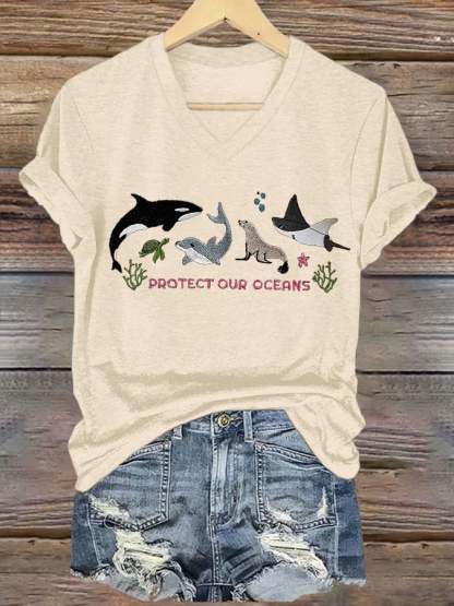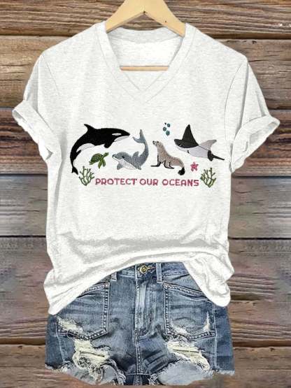 Women's Retro Protect Our Oceans Print T-Shirt