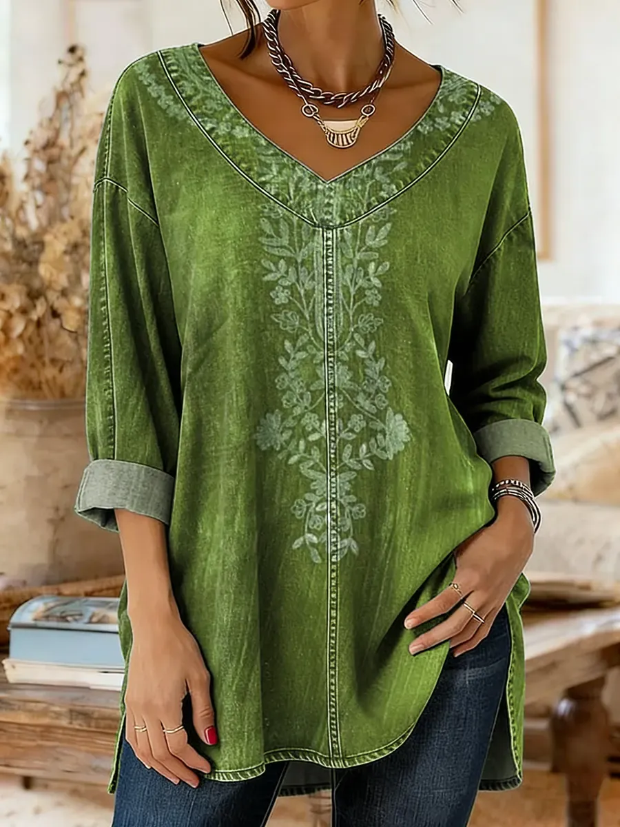 Ethnicity Flowers Totem Women's Art Print Casual Washed Denim Cotton Top