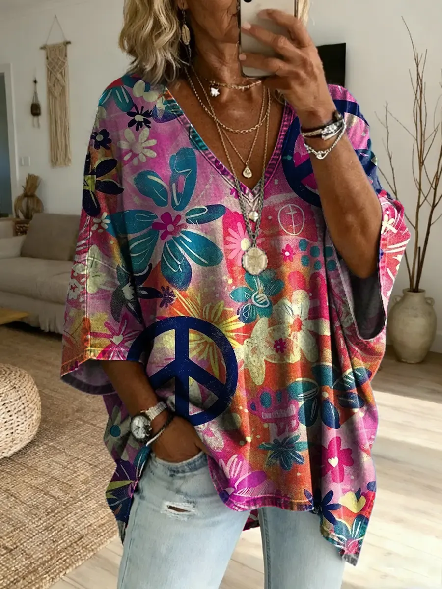 Hippie Colorful Flowers Women's Art Print Casual Washed Cotton Denim Top
