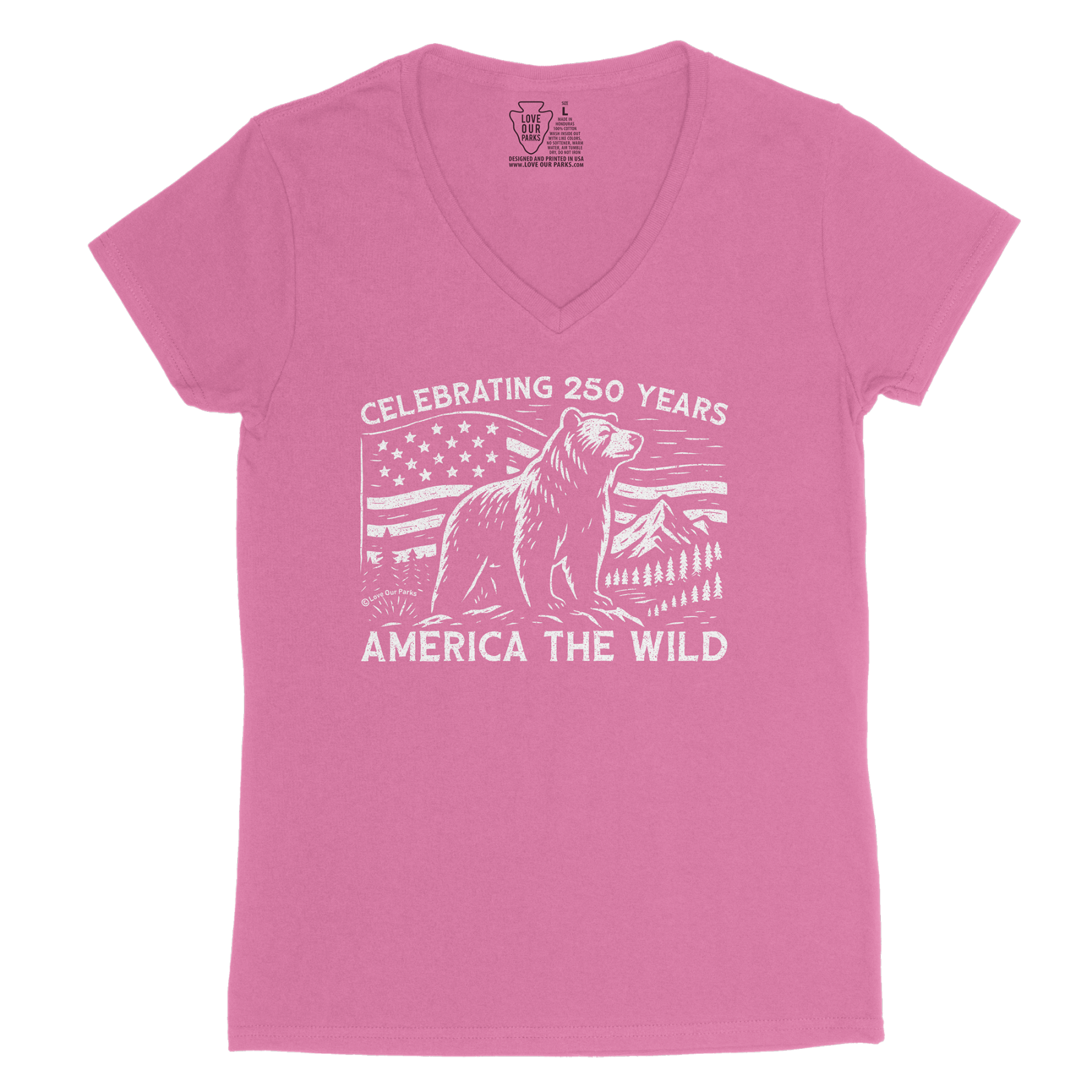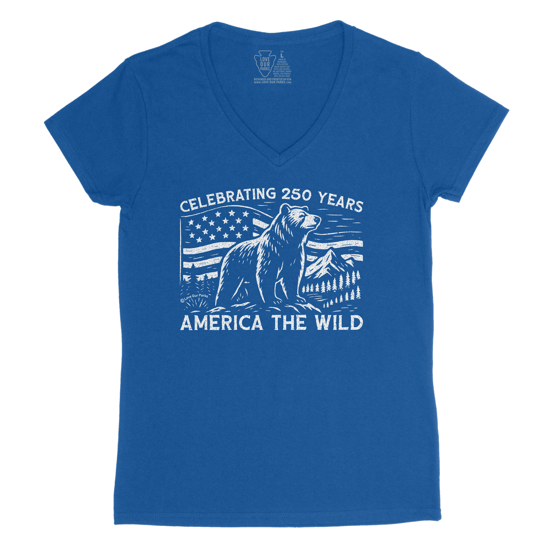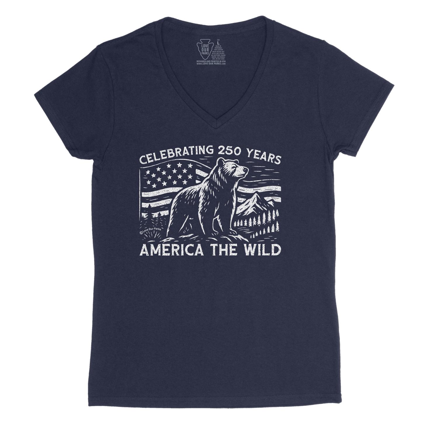 Celebrate early with our America The Wild Women's V-Neck Tee—honoring the upcoming 250th anniversary of the United States on July 4, 2026. Featuring a grizzly bear against mountains, forests, and the American flag, this design pays tribute to our nation’s heritage and wild landscapes. Made from soft 100% cotton and printed in the USA, it’s perfect for National Park lovers, outdoor adventurers, and patriots alike. Every purchase helps support the preservation of America’s National Parks.