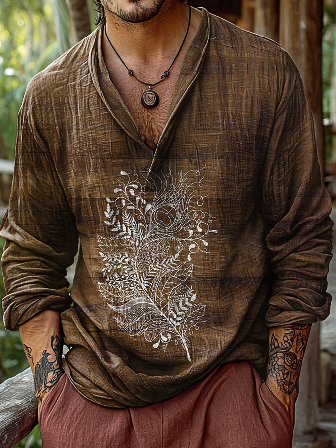 Men's Bohemian Feather Art Print Cotton Linen Casual Shirt