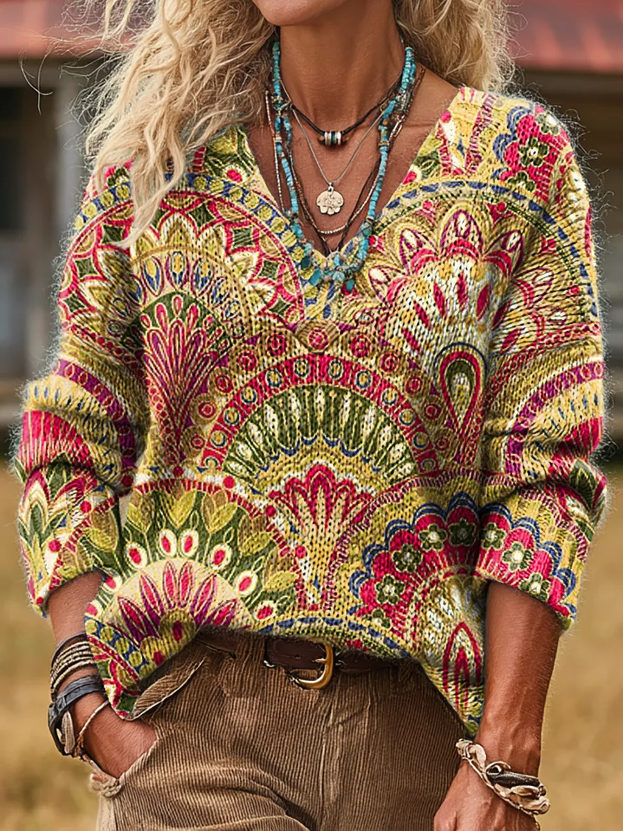 Unisex Colorful Ethnic Floral Art Print Casual Long-sleeved V-neck Wool Blend Knitted Sweater