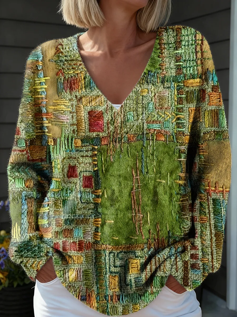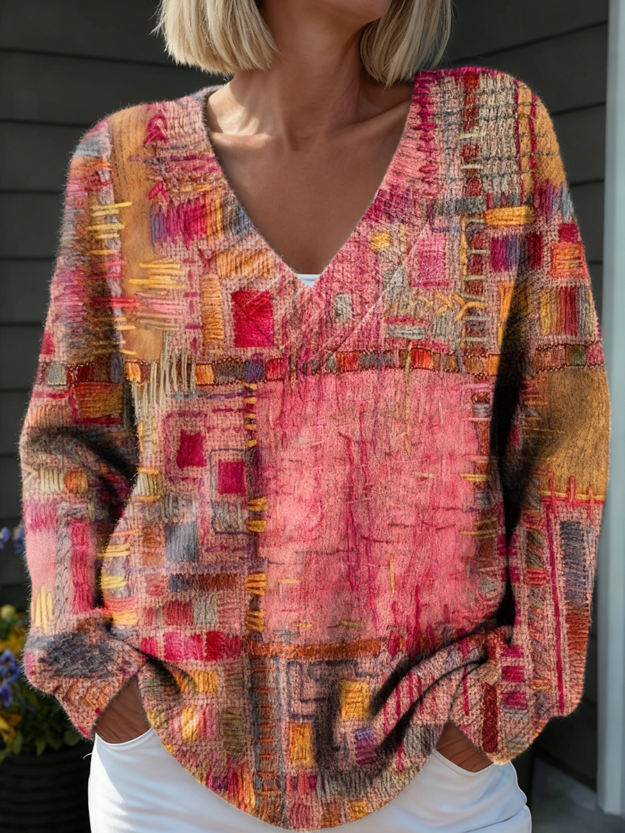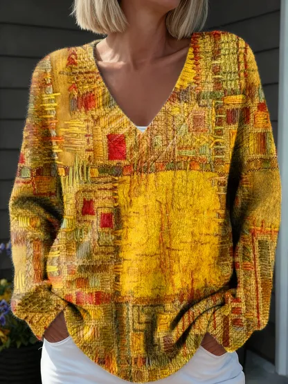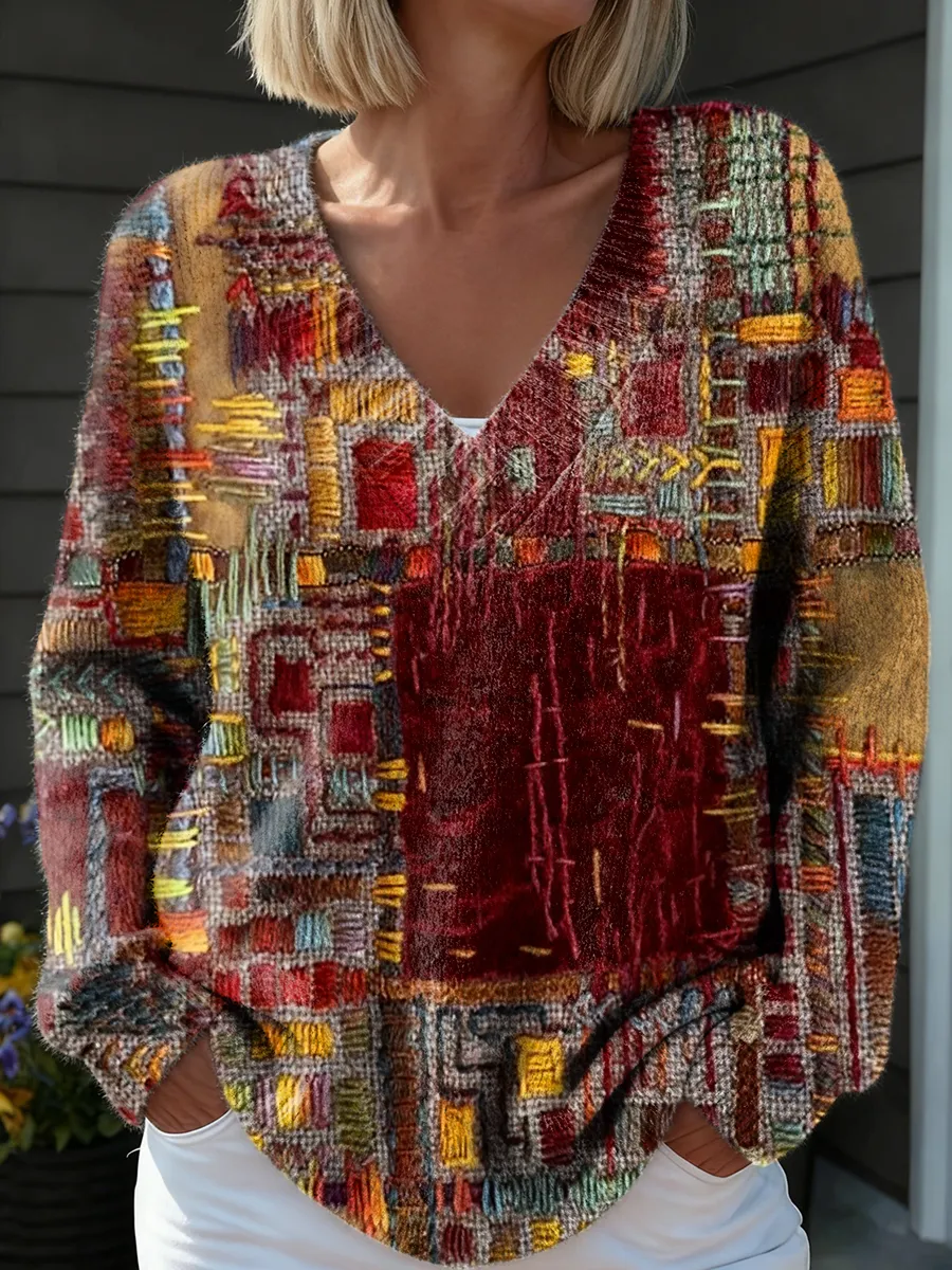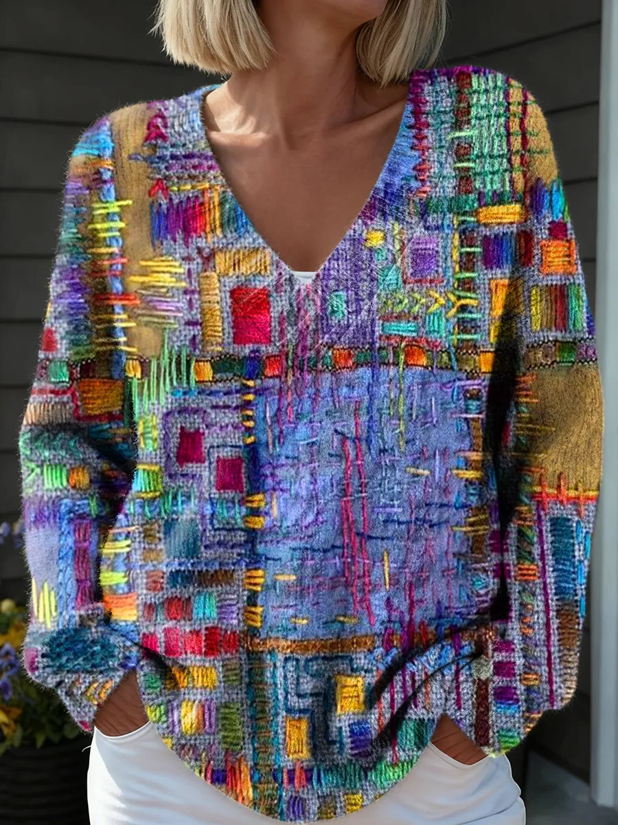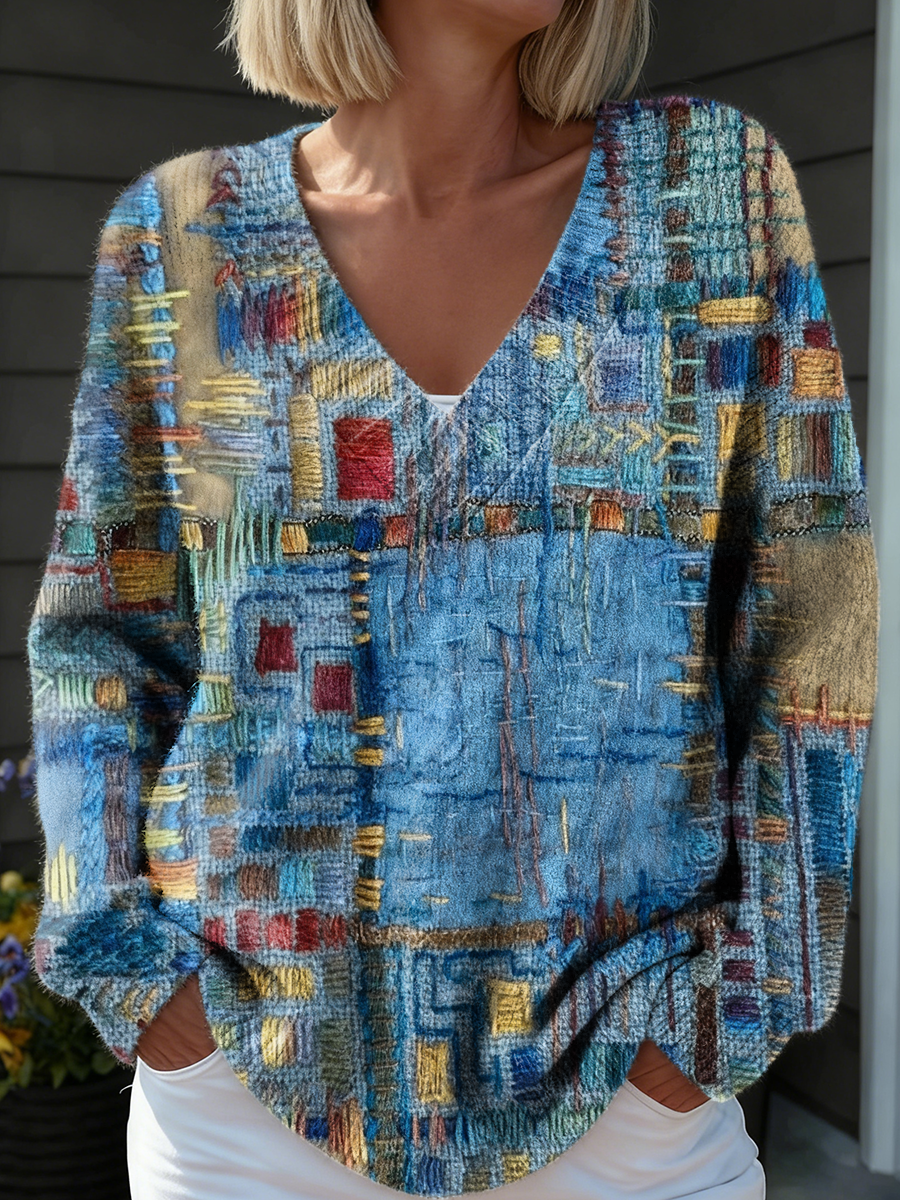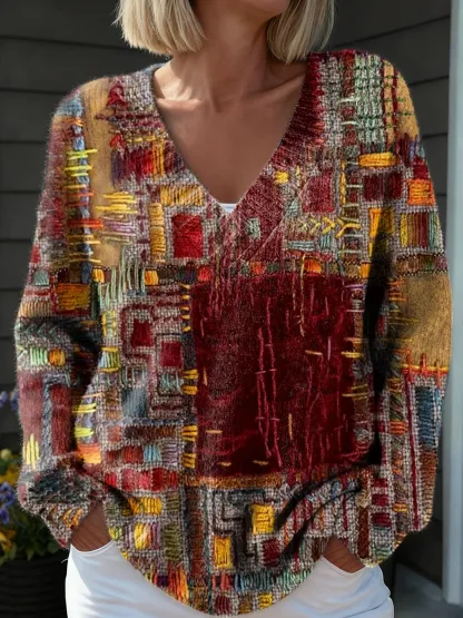 Unisex Retro Colorful Art Print Long-Sleeve V-Neck Wool Blend Knit Sweater