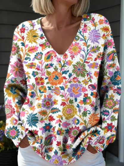 Unisex Vintage Floral Art Print Long-sleeved V-neck Wool Blend Knitted Sweater