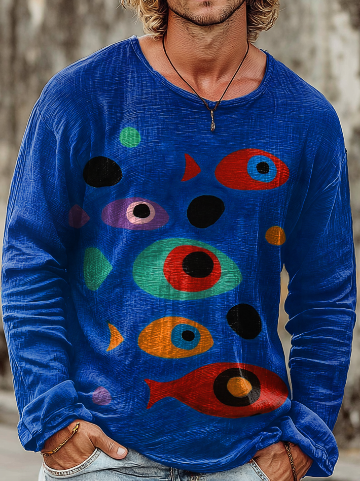 Mens Vintage Blue Abstract Fish Art Print Casual Round Neck Pullover Cotton Shirt