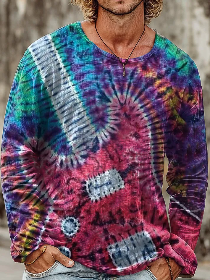 Mens Vintage Guitar Tie-dye Art Printed Casual Round Neck Pullover Cotton Shirt