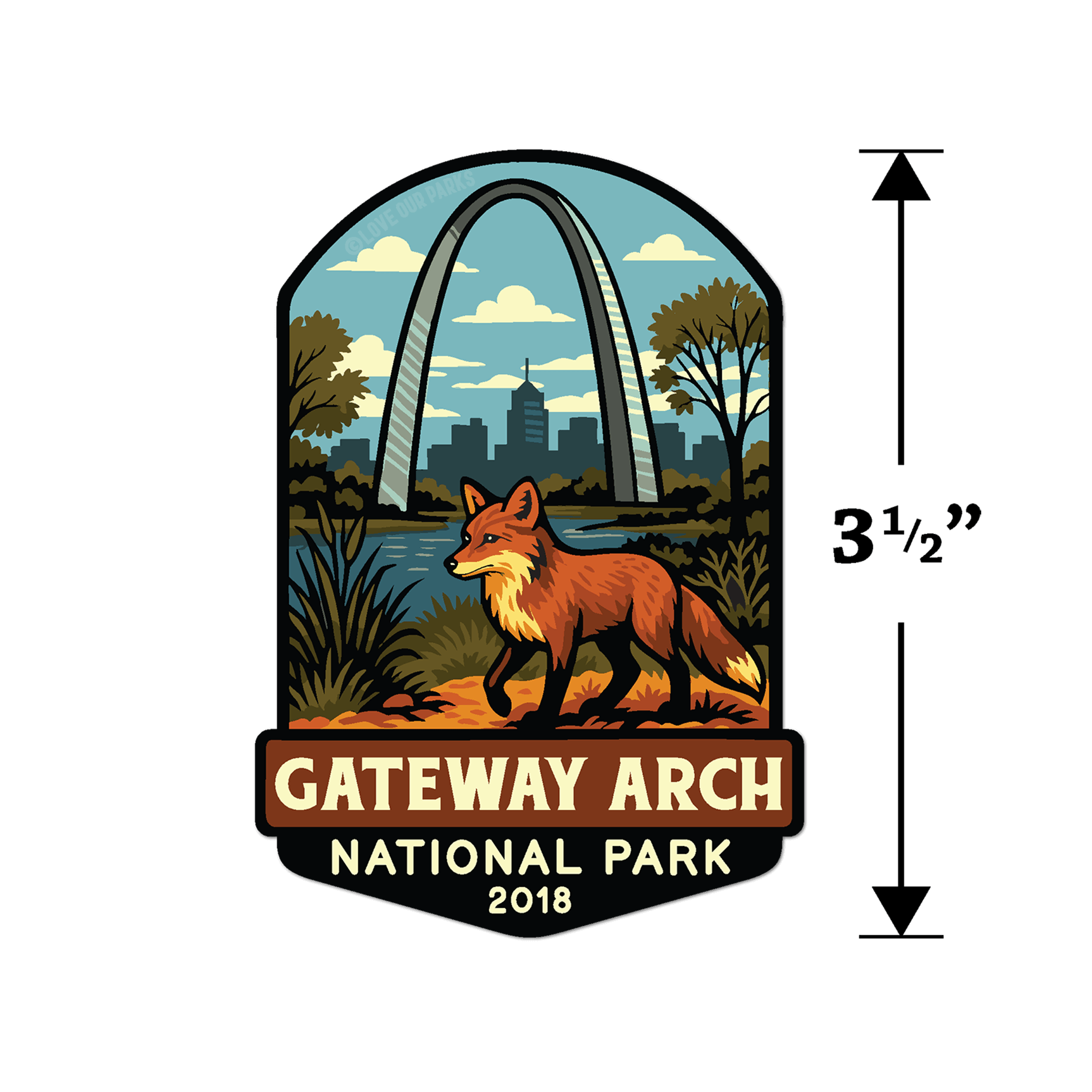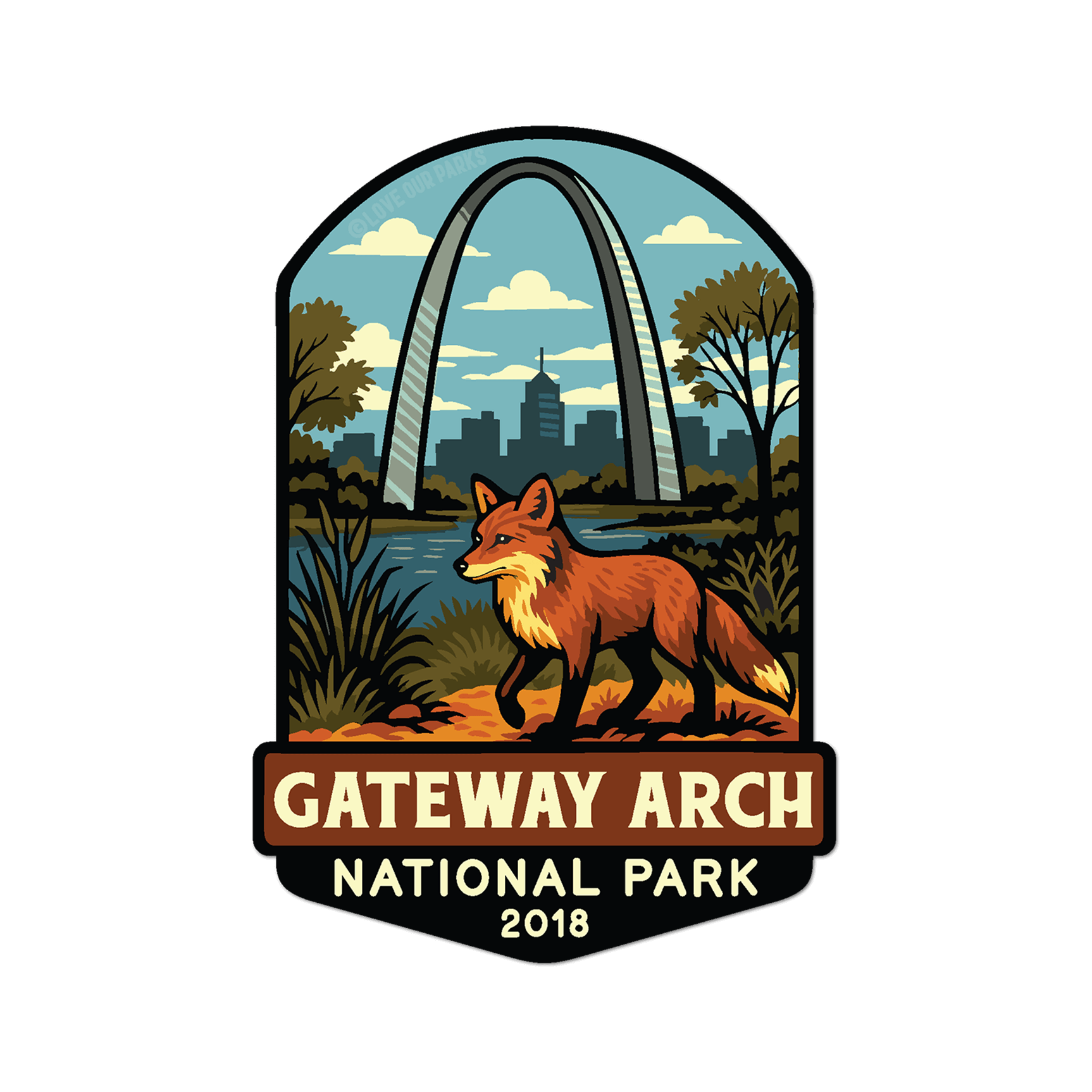Celebrate the iconic symbol of westward expansion with our Gateway Arch National Park sticker. Featuring a red fox exploring the park’s riverfront landscape beneath the towering Gateway Arch and St. Louis skyline, this design honors one of America’s most unique urban National Parks.