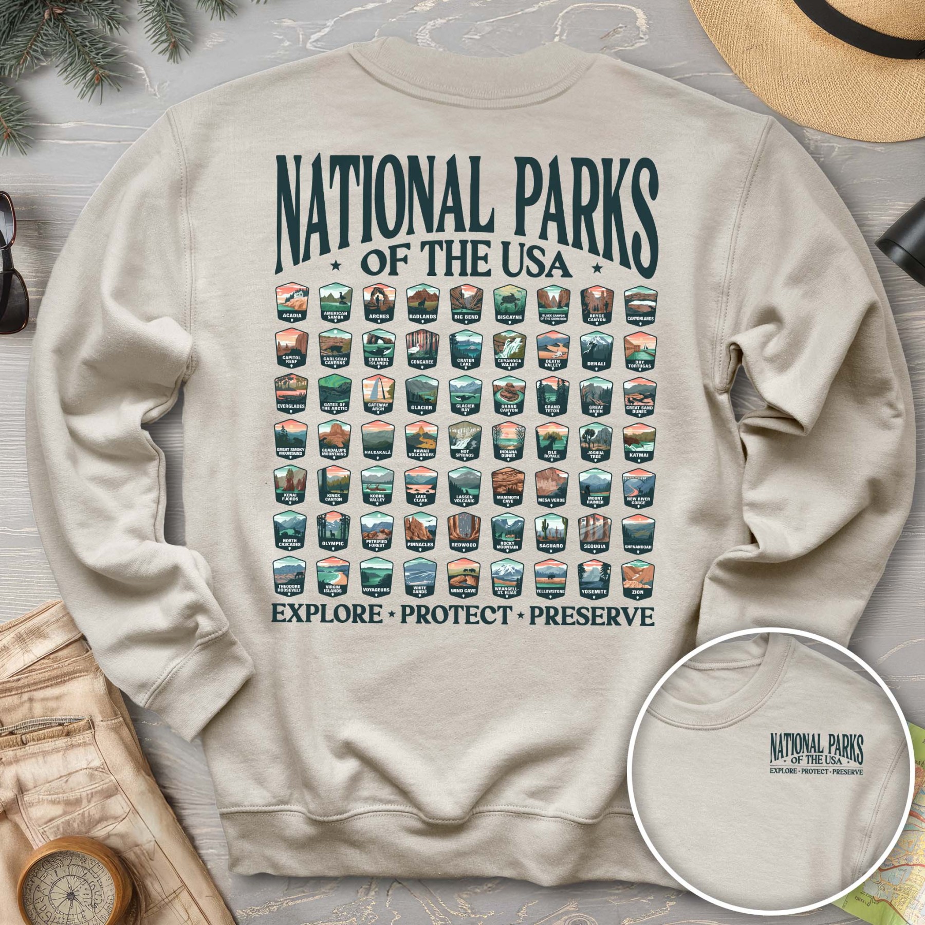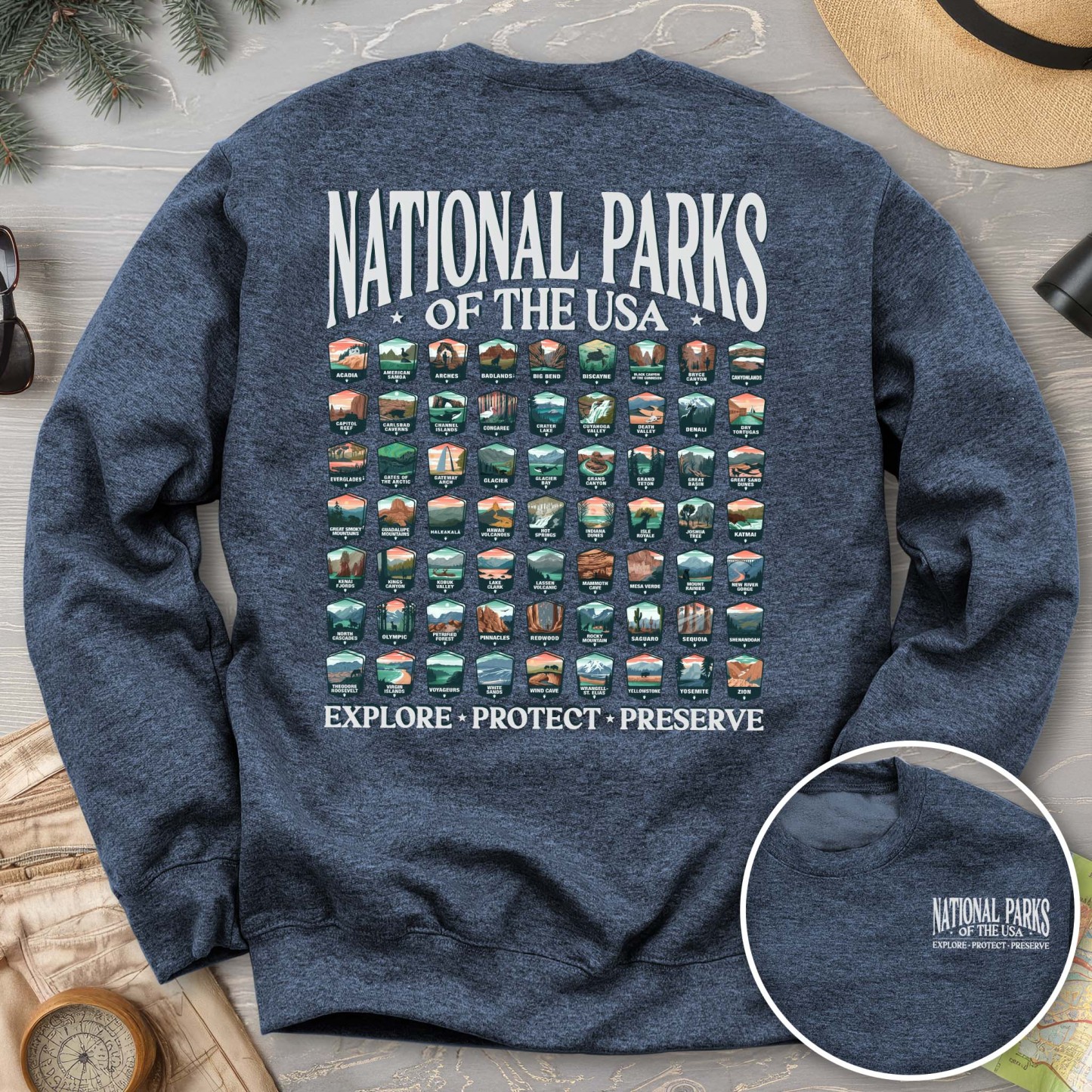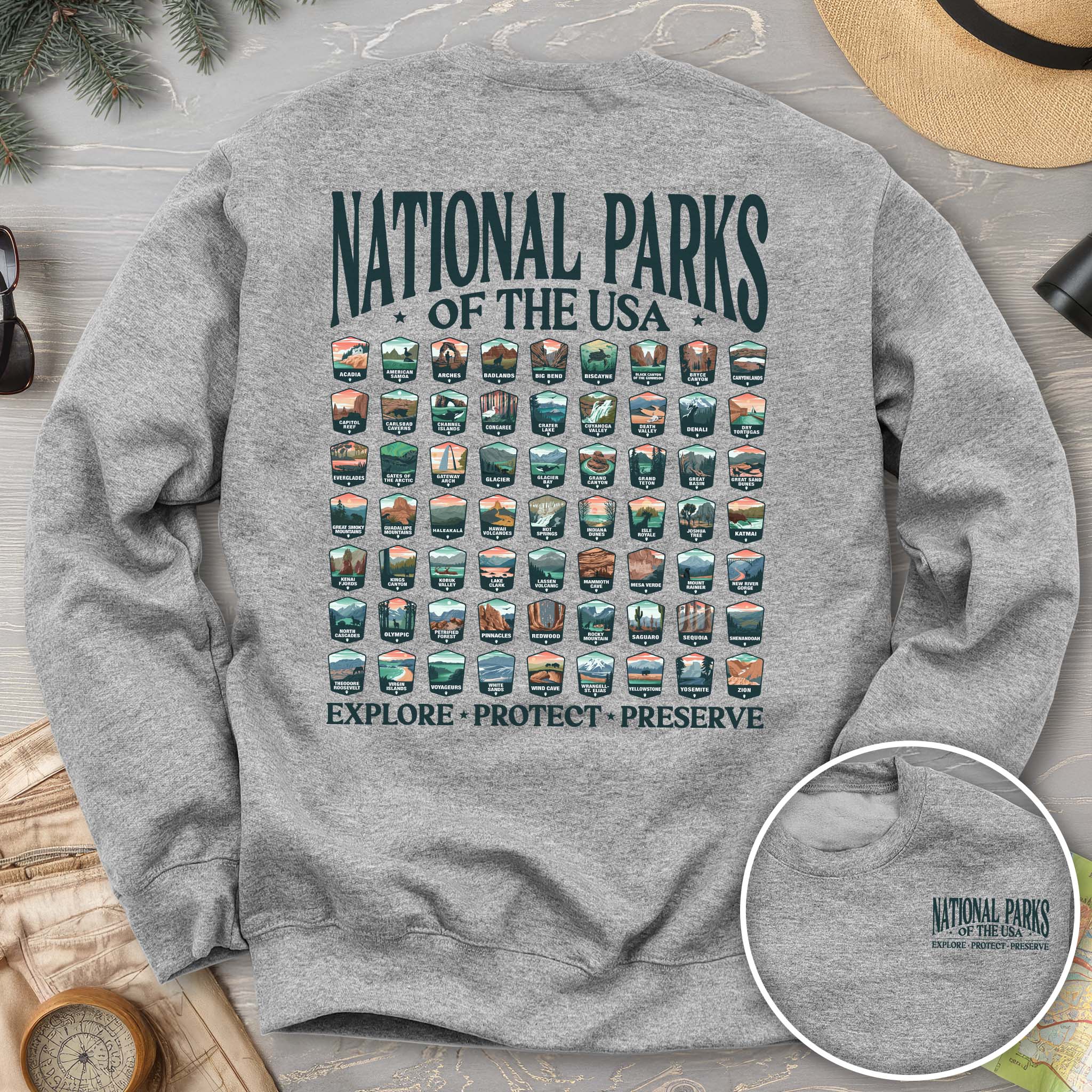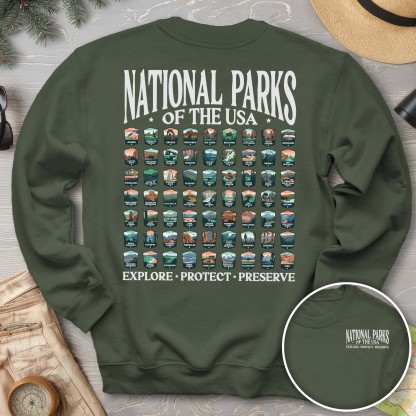 Celebrate all 63 US National Parks with our custom "National Parks of the USA" sweatshirt from Triangle Threads. This crewneck features unique badge designs for ALL 63 US NATIONAL PARKS! The Gildan 18000 50/50 blend sweatshirt has a comfy, lived-in feel that is perfect for rock climbing, hiking, camping, or wherever your day may take you. Get ready for adventure and grab yours today!