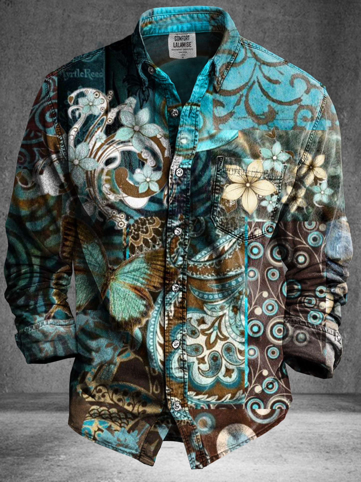 Vintage Abstract Ethnic Floral Totem Art Print 100% Cotton Long Sleeve Shirt