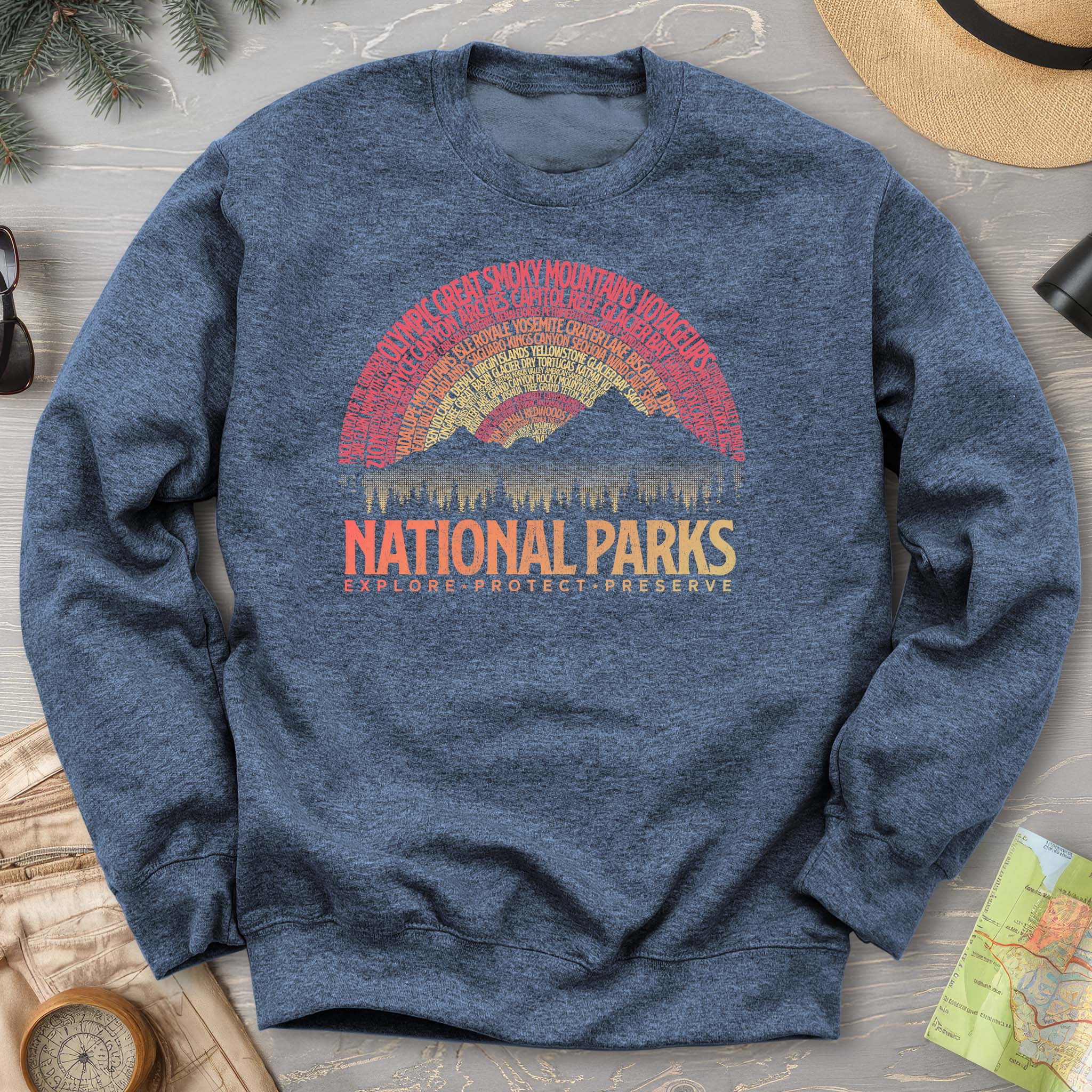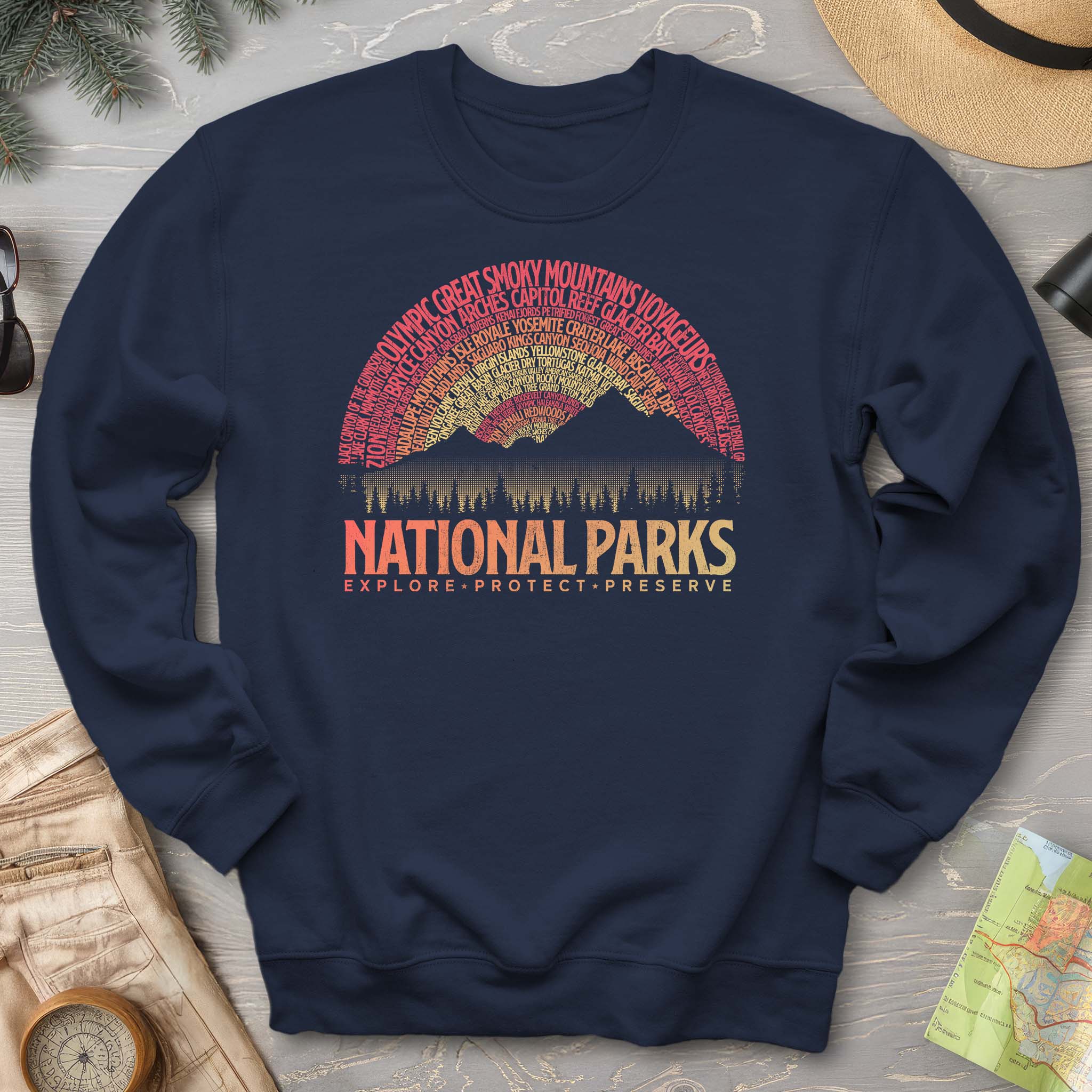 Celebrate your love for the great outdoors with the National Parks Word Art "Vintage Sunset" Sweatshirt. Featuring a playful vintage sunset design, this cozy sweatshirt brings a splash of retro charm to your casual wardrobe. Perfect for chilly evenings around the campfire or a relaxed day exploring, it combines comfort with a fun nod to nature’s beauty. Embrace adventure in style and warmth!
