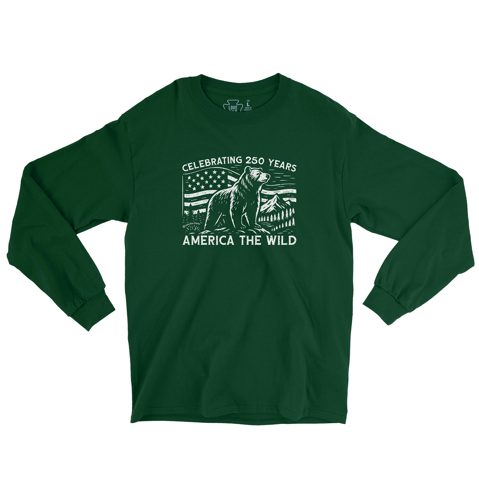 Celebrate early with our America The Wild Long Sleeve Tee—honoring the upcoming 250th anniversary of the United States on July 4, 2026. Featuring a grizzly bear against mountains, forests, and the American flag, this design pays tribute to our nation’s heritage and wild landscapes. Made from soft 100% cotton and printed in the USA, it’s perfect for National Park lovers, outdoor adventurers, and patriots alike. Every purchase helps support the preservation of America’s National Parks.