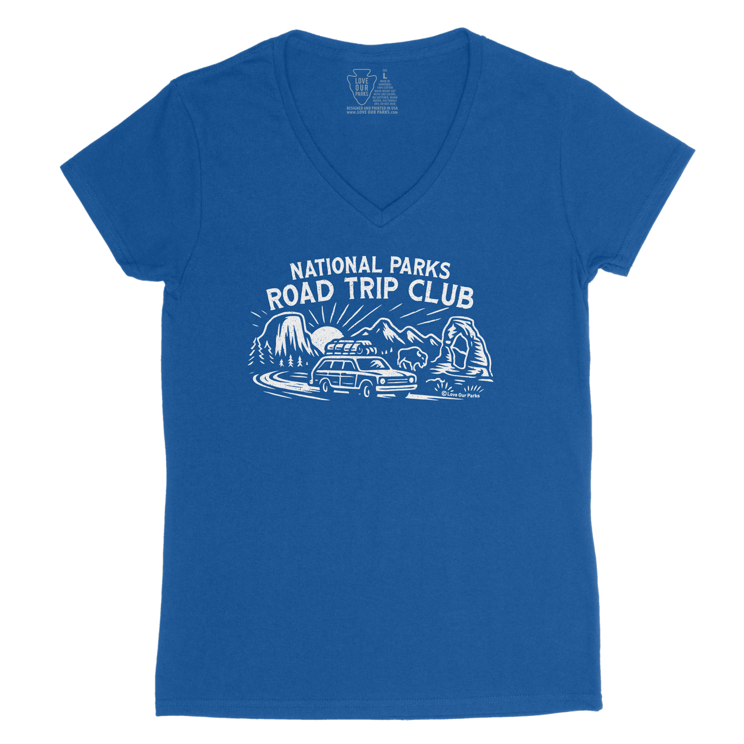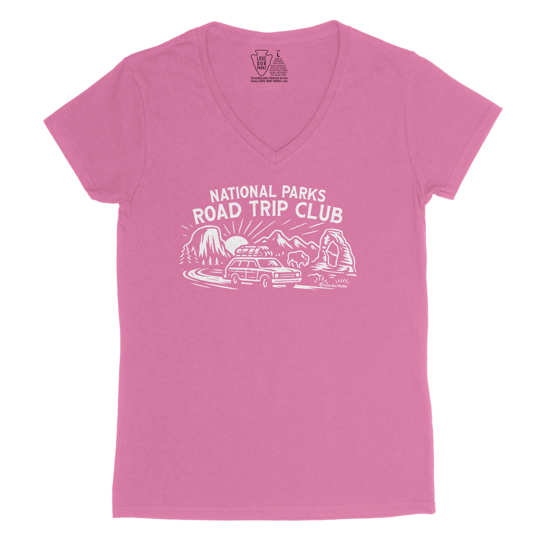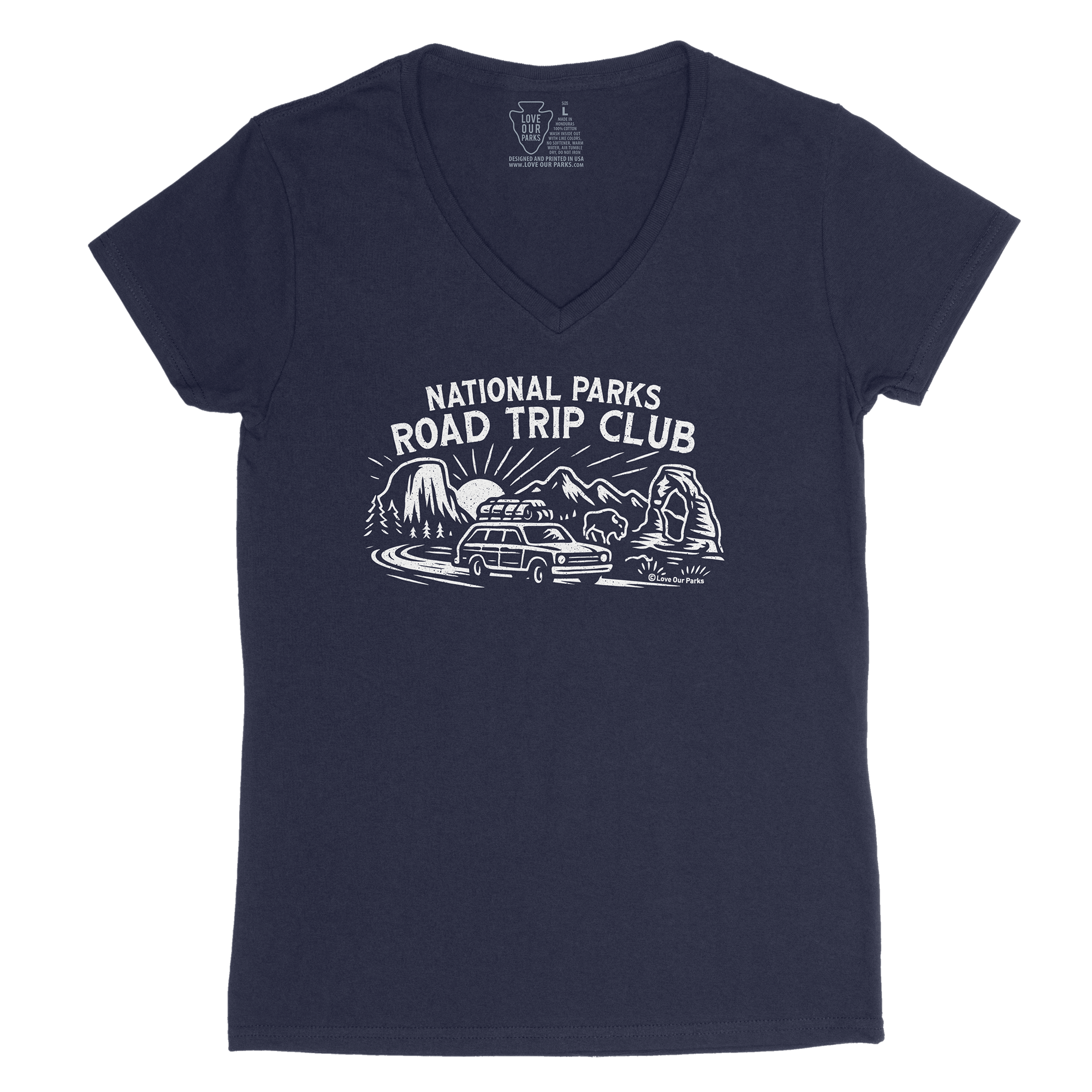 Hit the open road in style with our National Parks Road Trip Club Women's V-Neck Tee! This shirt features artwork of a vintage station wagon cruising past iconic National Park landmarks, including mountains, bison, and winding roads. The design captures the freedom and adventure of exploring America’s wild places. It's perfect for road trip enthusiasts, National Park lovers, and anyone who believes that the journey is just as memorable as the destination.