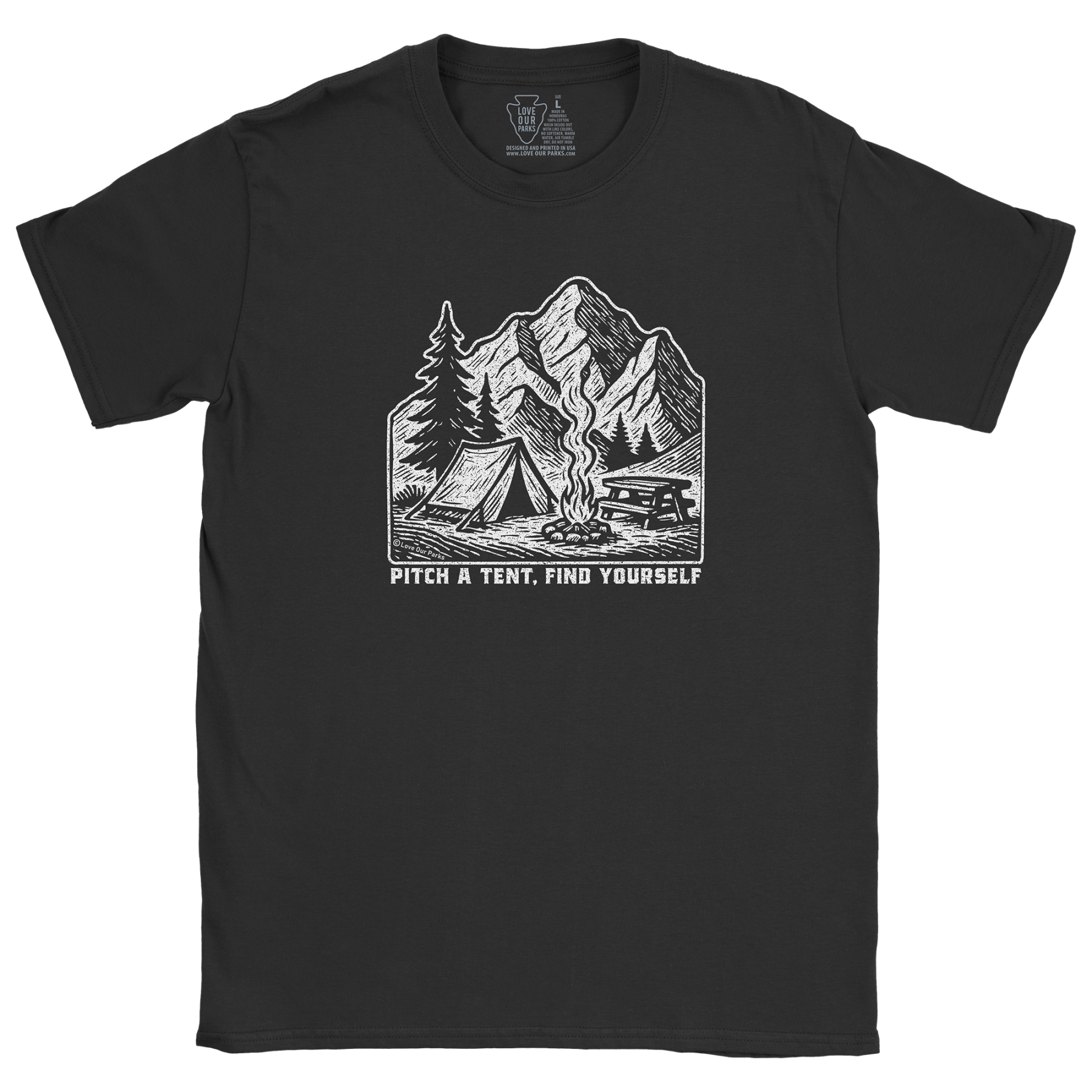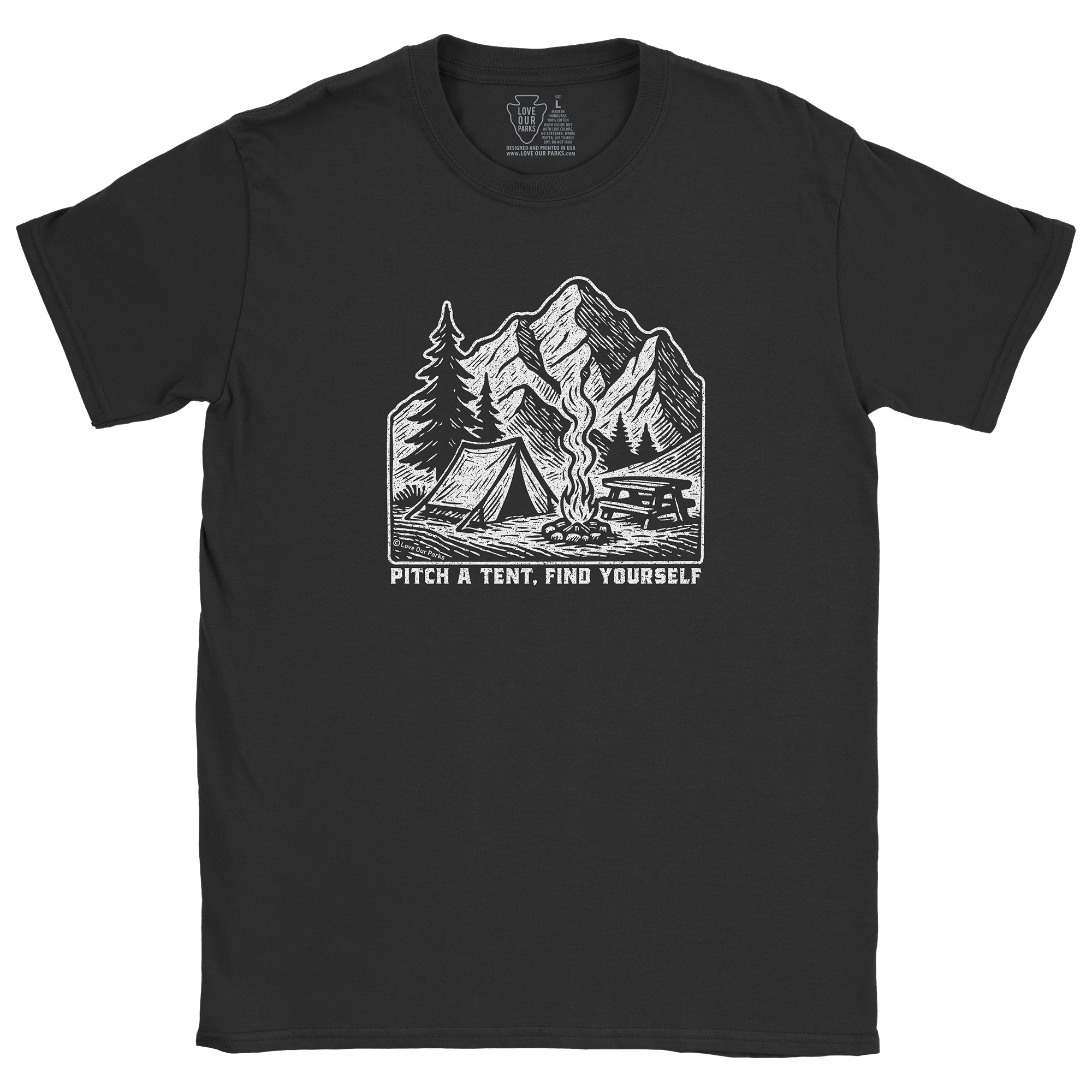 Reconnect with the wild on your terms with our Pitch A Tent, Find Yourself Tee. Featuring the scene of a tent pitched beside a crackling campfire beneath alpine peaks, this design captures the quiet, grounding power of a night in nature. With the phrase “Pitch A Tent, Find Yourself,” it’s a reminder that sometimes, all it takes to rediscover who you are is a little time under the stars.