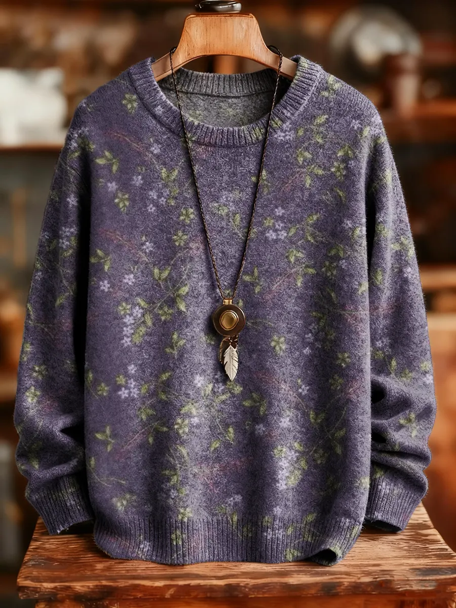 Unisex Retro Floral Art Print Crew Neck Knit Sweater