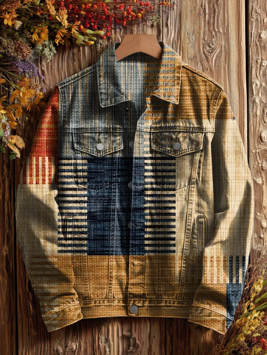 Unisex Vintage Geometric Collage Art Print Casual Denim Jacket