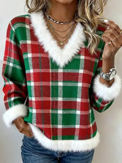 Unisex Red And Green Checkered Art Print Casual V-neck Sweater