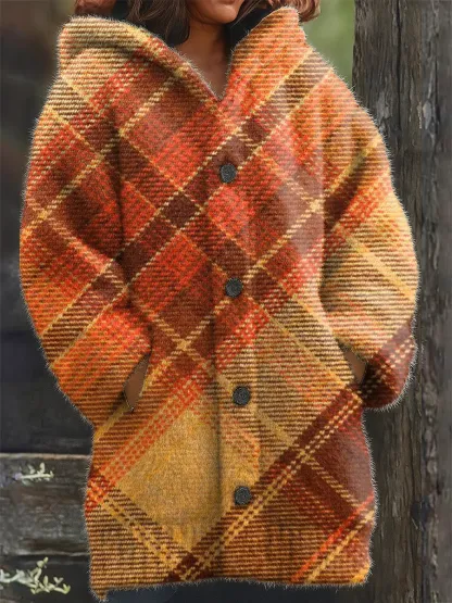 Unisex Retro Plaid Art Print Casual Long-Sleeved Hooded Fleece Jacket