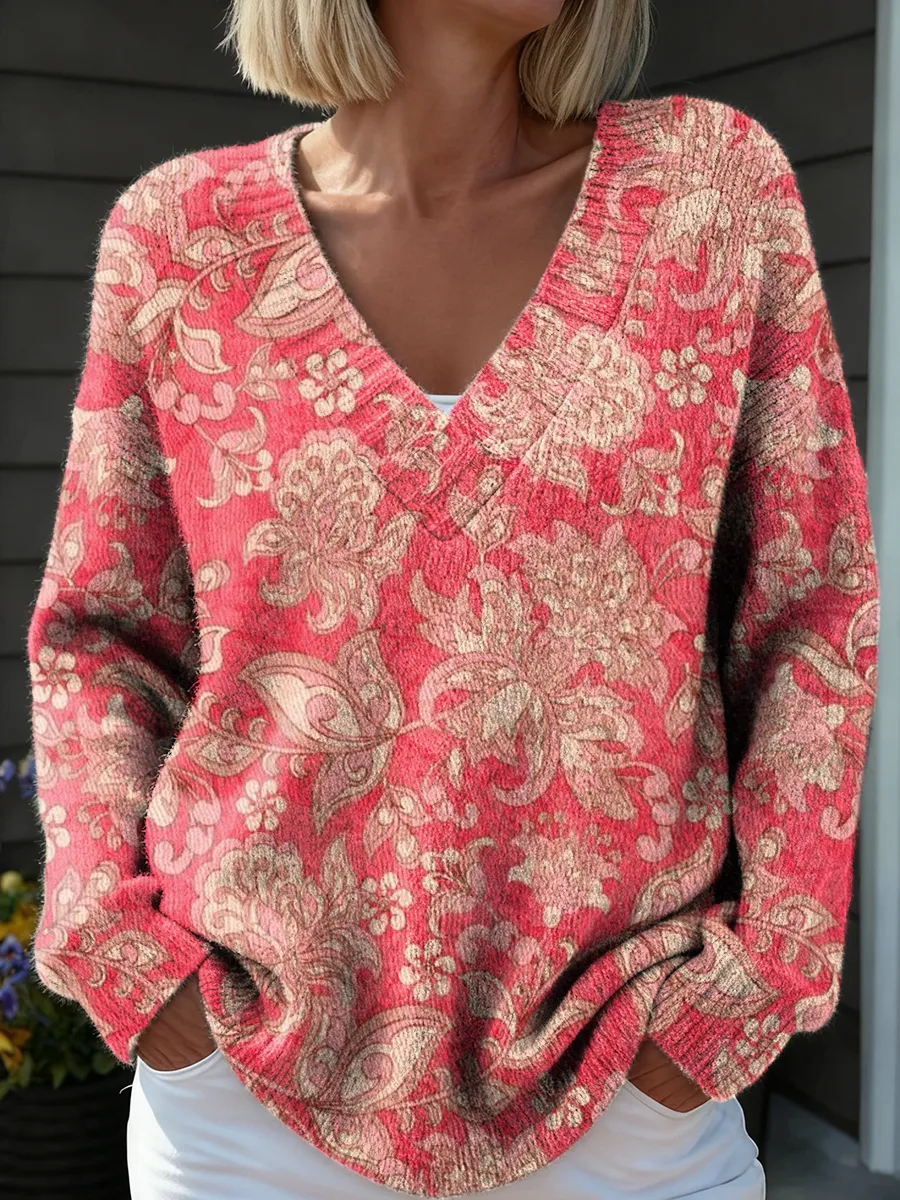 Unisex Vintage Floral Art Print Long-sleeved V-neck Wool Blend Knitted Sweater