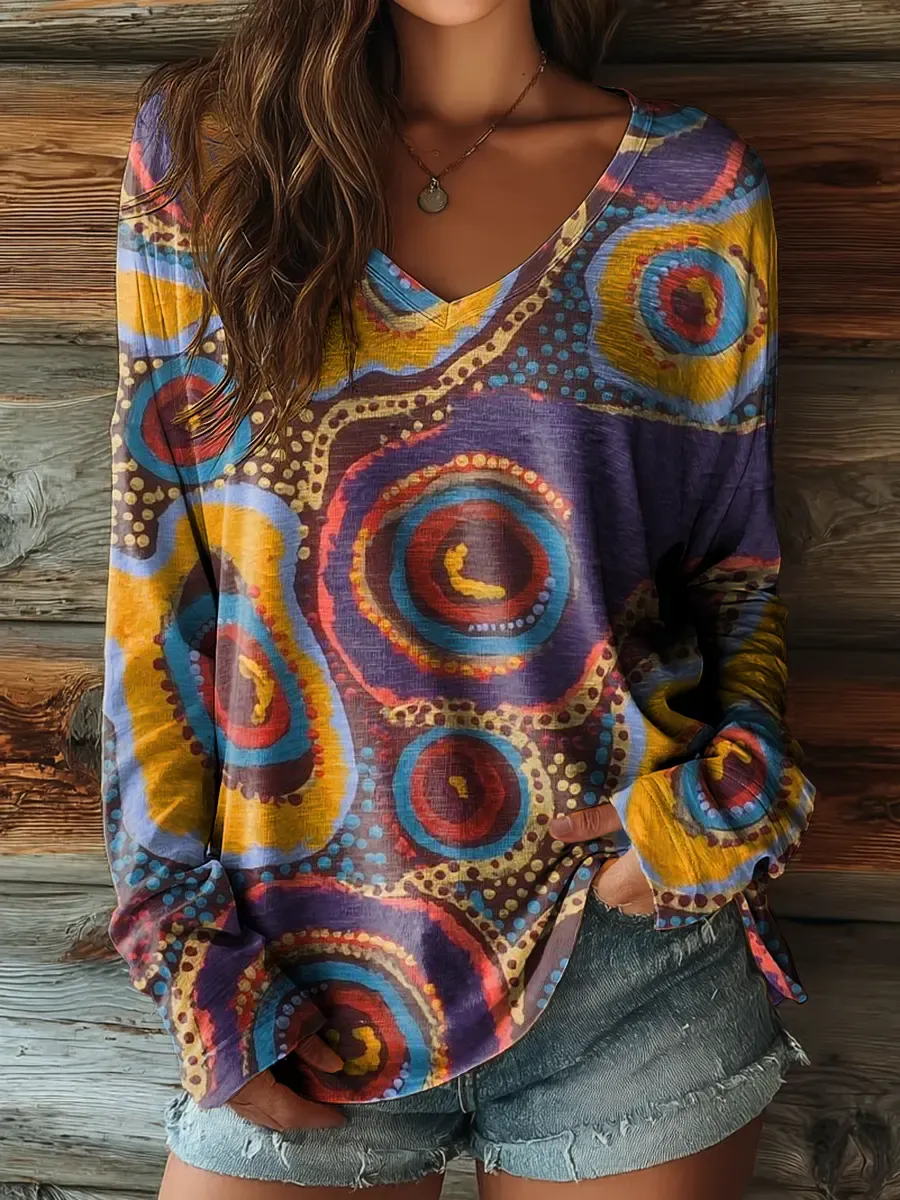 Women's Bohemian Abstract Pattern Art Print Casual V-neck Long-sleeve T-shirt