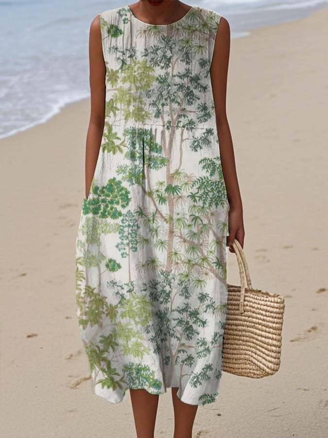 Women's casual forest animal plant flower cotton and linen dress