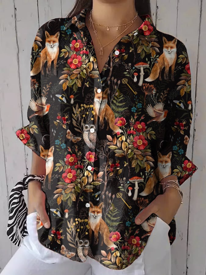 Women's Casual Forest Plant Animal Cotton And Linen Shirt