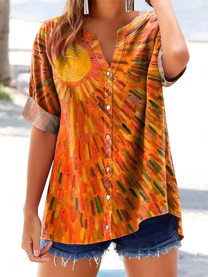 Women's Color Sun Art Print Casual Short Sleeve Cotton and Linen Shirt