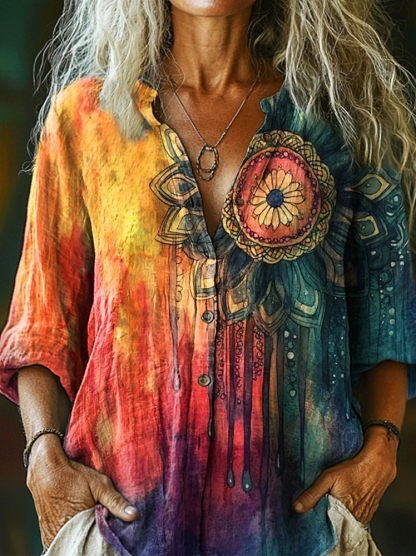Women's Colorful Mandala Print Casual Cotton Linen Shirt