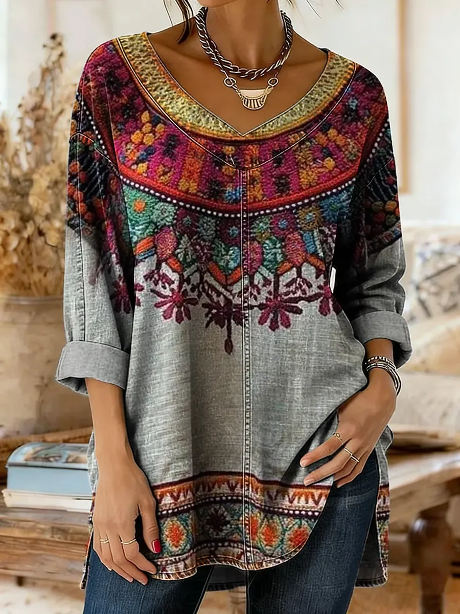 Women's Ethnic Floral Art Print Casual Washed Denim Cotton Top