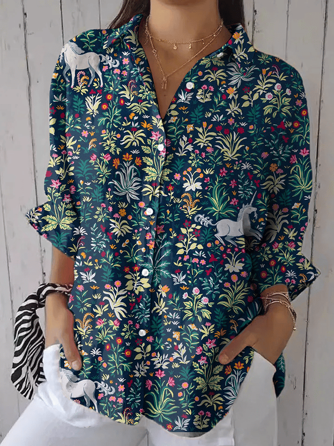 Women's Forest Floral Unicorn Print Casual Lapel Shirt