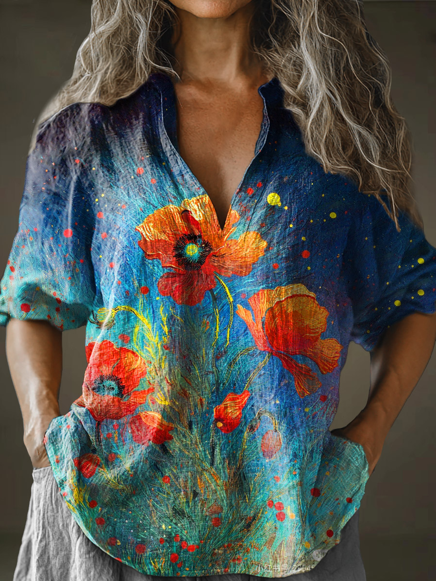 Women's Poppy Flower Art Pattern Print Long Sleeve Comfortable Cotton And Linen Shirt