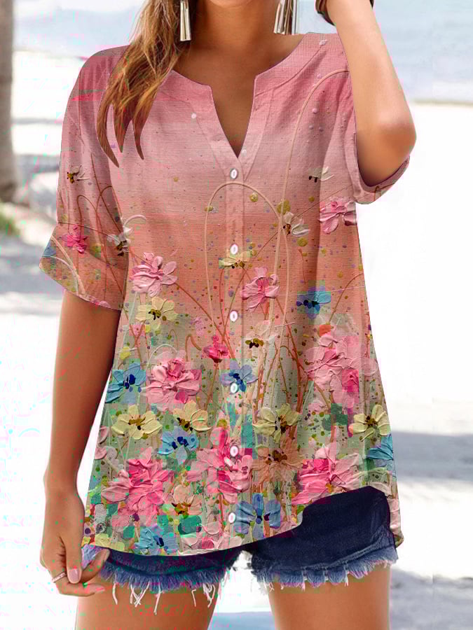 Women's Retro Botanical Floral Button Design V-Neck Three-Quarter Sleeve Shirt