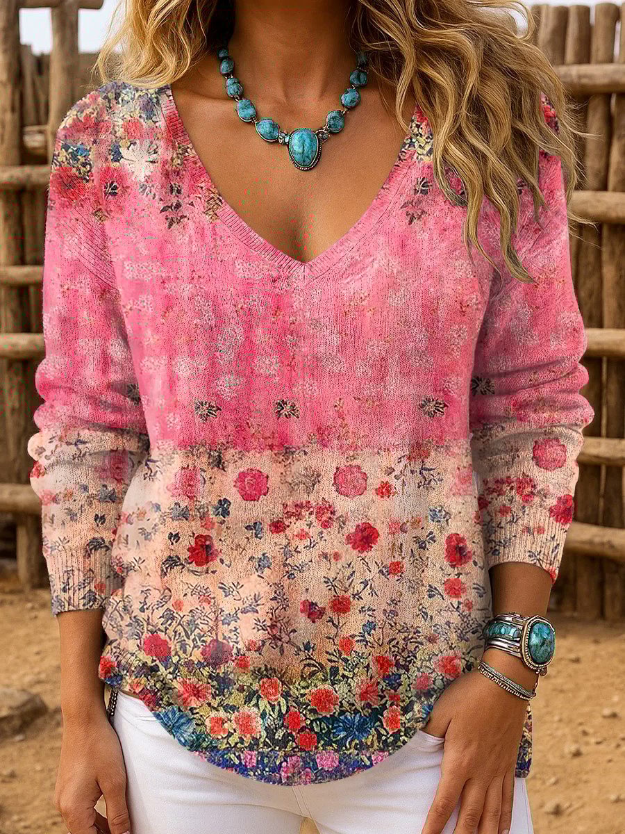 Women's Retro Floral Striped Long Sleeve Top
