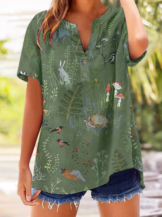 Women's Vintage Botanical Floral Button Design V-Neck Short Sleeve Shirt